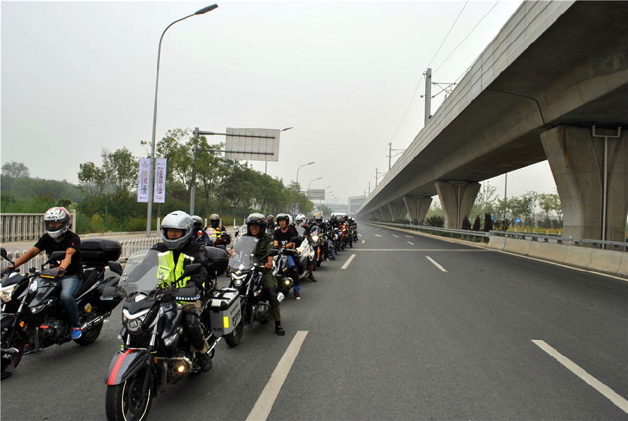 路上,大家自觉遵守交规,车队排列整齐,体现了首都摩友风采。