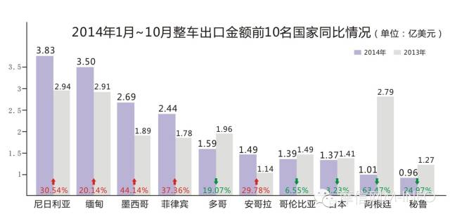 在内需不振、国内市场逐渐缩小的形势下,海外市场成为很多摩托车企业大力开拓的重点。前几年,海外出口市场一直呈现上扬趋势,但随着竞争压力的增大,2014年摩托车的出口市场也开始遭遇滑铁卢,出口量和出口金额都不同程度地下滑。2014年1月~10月,我国摩托车类商品(含整车、发动机、沙滩车、零配件)共计出口了75.52亿美元。其中整车出口7737971辆,同比减少6.75%;出口金额41.59亿美元,同比减少5.89%。从地区上看,整车出口值排名前10 的国家和地区分别为:尼日利亚、缅甸、墨西哥、菲律宾、多哥、安哥拉、哥伦比亚、日本、阿根廷、秘鲁。其中,尼日利亚、缅甸、墨西哥、菲律宾、安哥拉增长明显,同比增长率都在20%以上,尤其是墨西哥,出口值同比增长率甚至达到了44.14%。而多哥、阿根廷、秘鲁则呈现出较大的下降,阿根廷的出口值同比降幅甚至达到63.47%,下降趋势最为严重。
